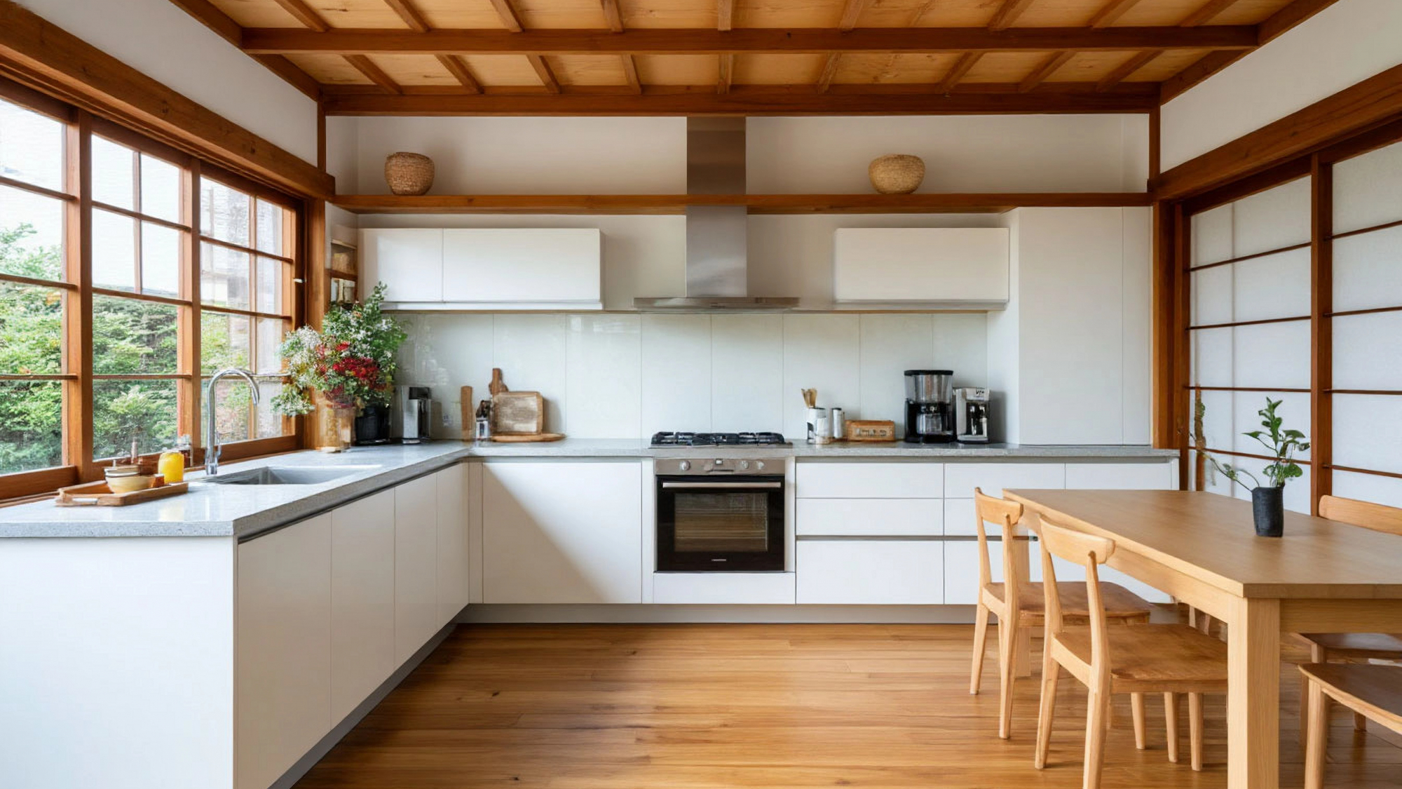 "Киока" словно приглашает к ритуалам — не быстрым, а продуманным. Заварить чай в керамическом чайнике, разложить на деревянной доске свежие фрукты, вдохнуть аромат риса — всё это становится частью повседневной поэзии. Кухни в японском стиле живут по законам света и воздуха, и "Киока" не исключение: её пространство будто наполнено мягким дыханием природы.