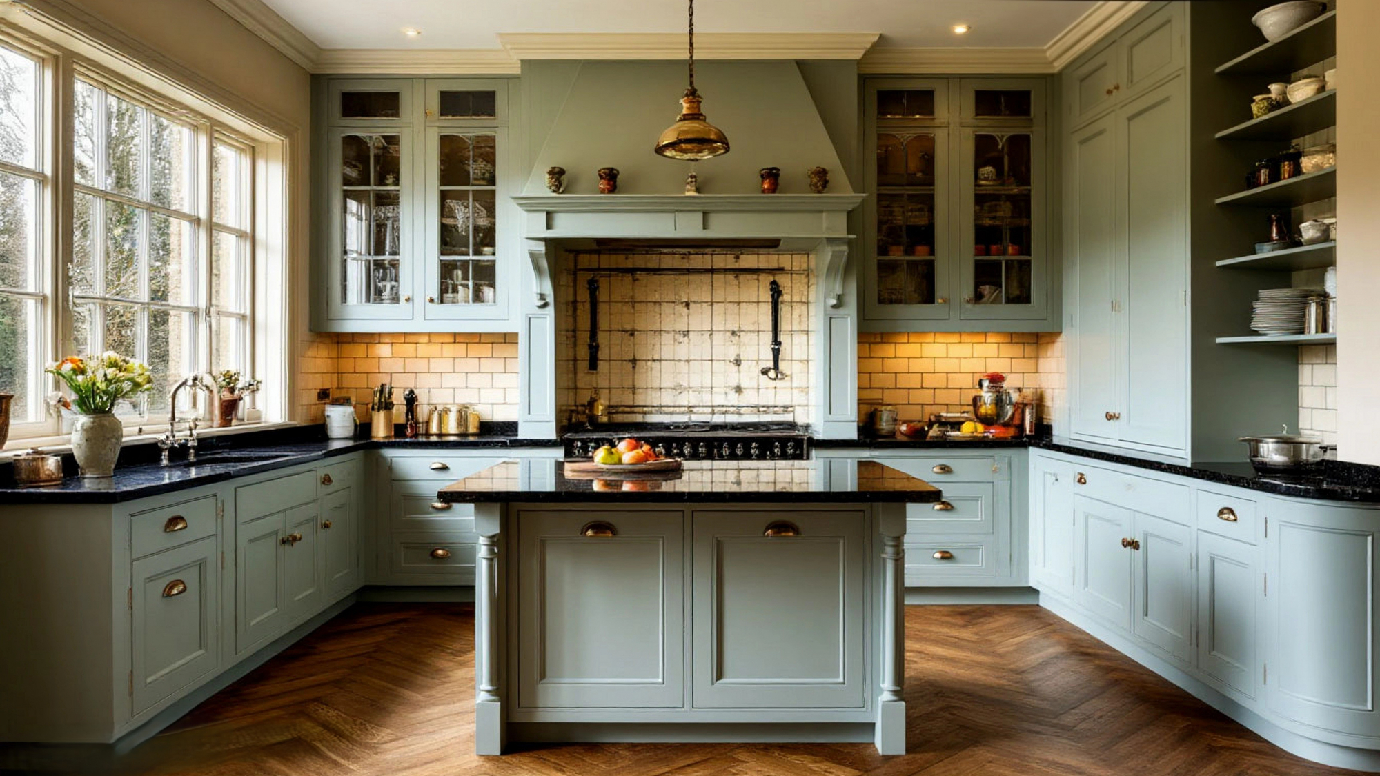 "Верден" – это воплощение тех самых кухонных традиций, которые ассоциируются с респектабельными английскими поместьями. Здесь нет случайных решений: каждая линия фасадов, каждая деталь продумана до мелочей. Эмалевое покрытие придает поверхности гладкость и легкий благородный блеск, который подчеркивает мягкий светло-зеленый оттенок. Именно этот цвет делает кухню особенно уютной и свежей, словно впуская в пространство дыхание весны. Он одновременно сдержан и жизнерадостен, что полностью соответствует характеру английских интерьеров, где ценится спокойная элегантность.